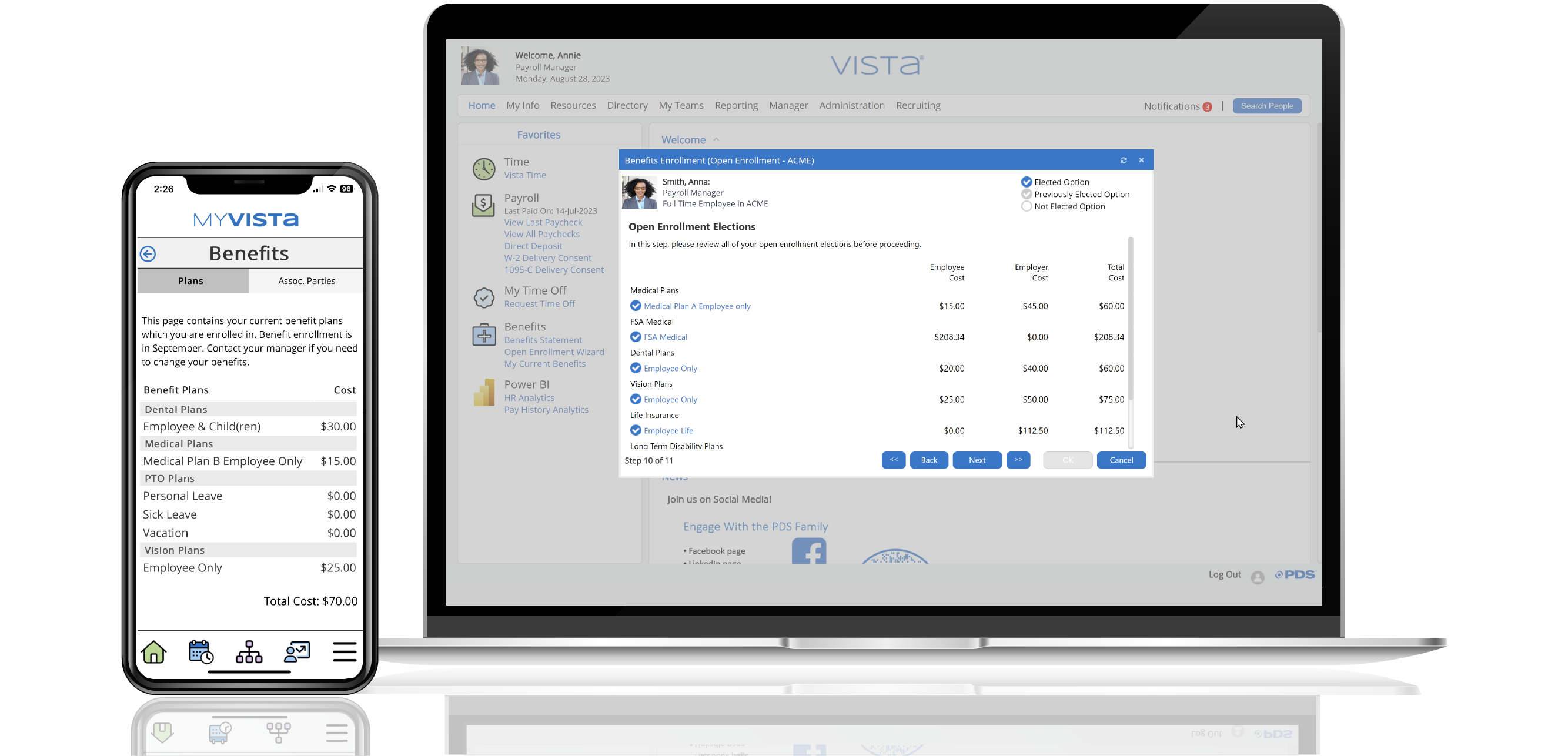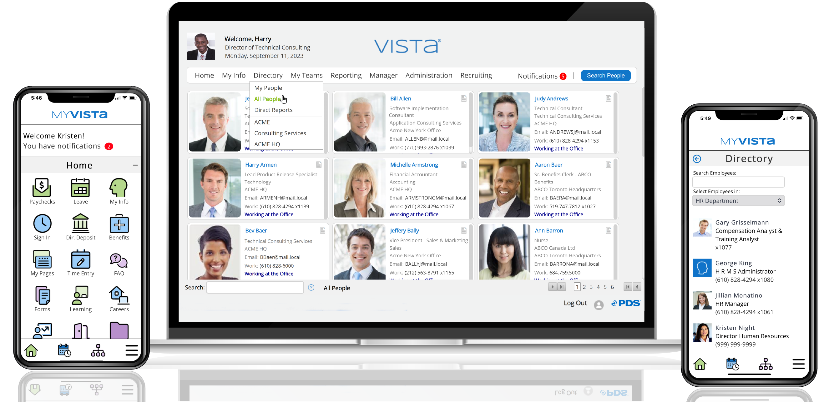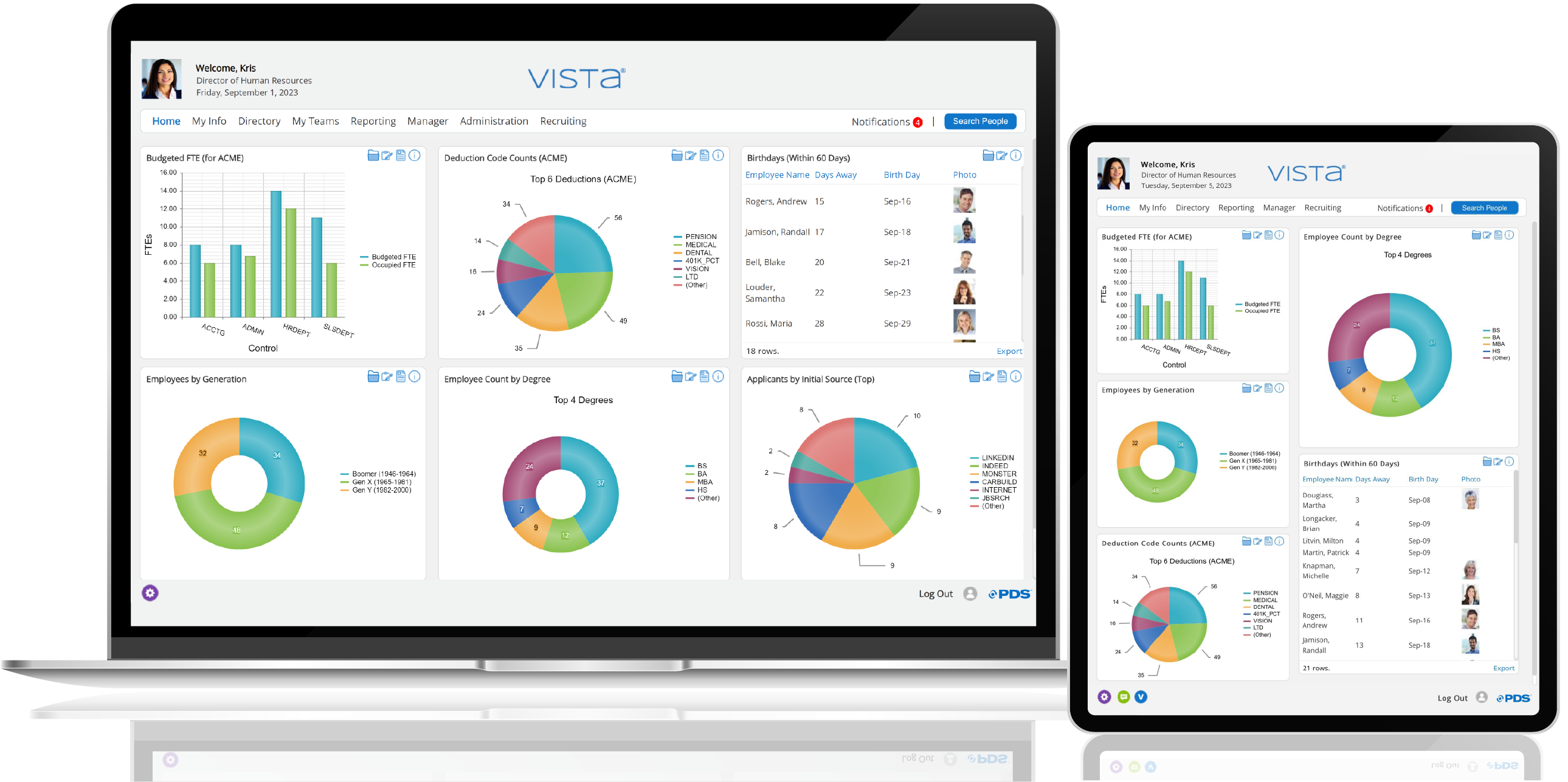 PDS’ Vista® is a complete HCM software solution for organizations with employees based in the United States, Canada, or the Caribbean. Vista is a core suite of recruiting, onboarding, human resources, payroll, benefits, time and attendance components that include self-service, engagement, workflow, analytics, and extensive reporting.